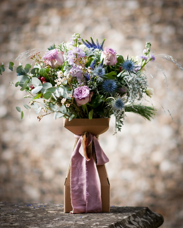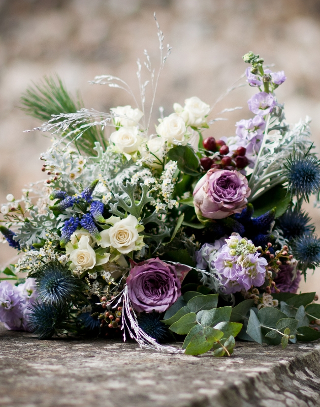 A world of ice and snow, lilac mountain peaks, and frosted branches – the inspiration for this pretty seasonal bouquet.