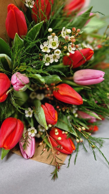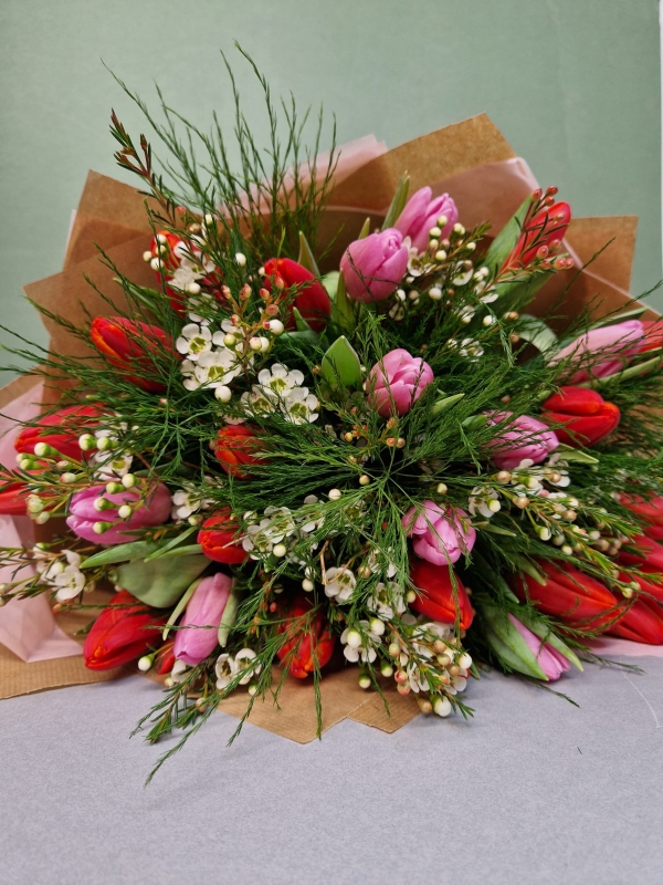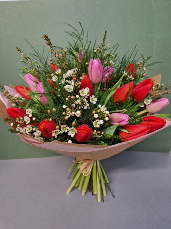 Each bouquet will be individually made by one of our florists using their choice of pretty tulips from our fresh delivery. If you want your bouquet presented in a gift box and water to keep it fresh (until it can be popped into a vase) then click on the option below. You can also choose to add a Canova candle or Coco Pzazz chocolate to make it an extra special delivery.