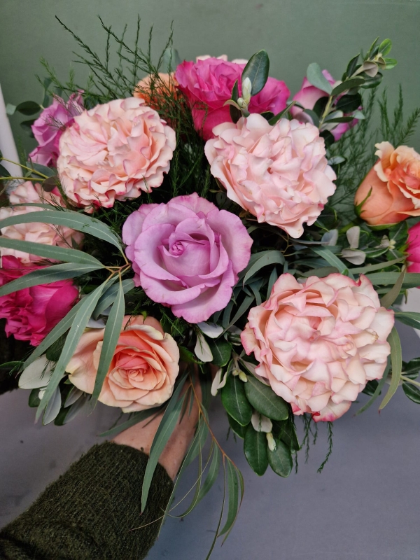 This rose-filled bouquet is created using a beautiful mix of pink, red, and lilac roses, coming together to create an elegant, romantic and timeless design.